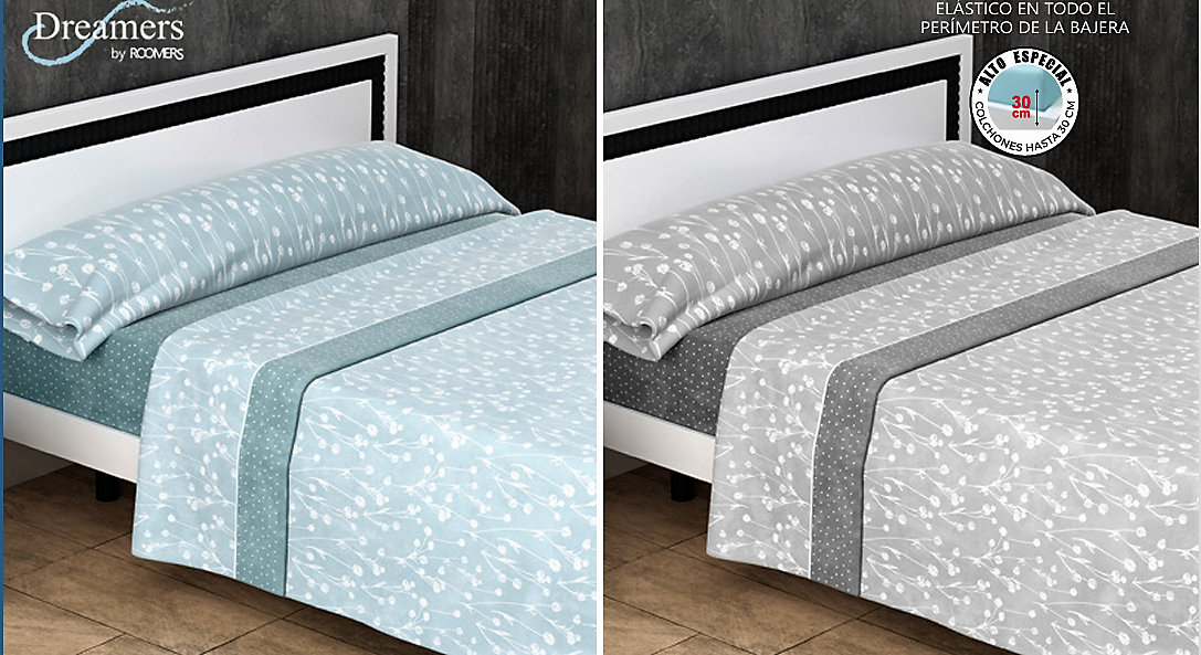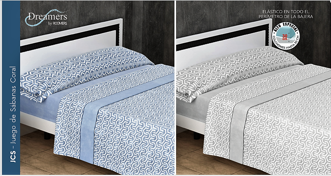 Sábana coral tacto sedalina, composición 50% Algodón y 50% Poliester, contiene: encimera, bajera ajustable y funda de almohada, colores: azul y gris, medidas: 90-105-135-150-160-180 y 200