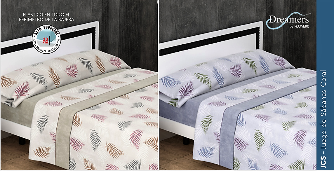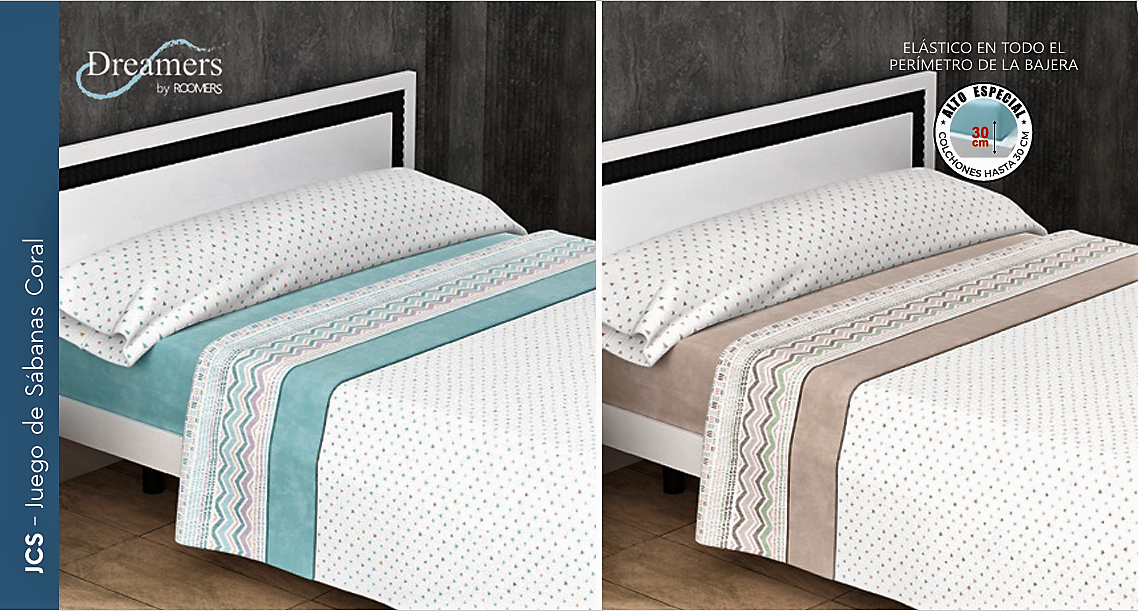 Sábana coral tacto sedalina, composición 50% Algodón y 50% Poliester, contiene: encimera, bajera ajustable y funda de almohada, colores: azul y beige, medidas: 90-105-135-150-160-180 y 200