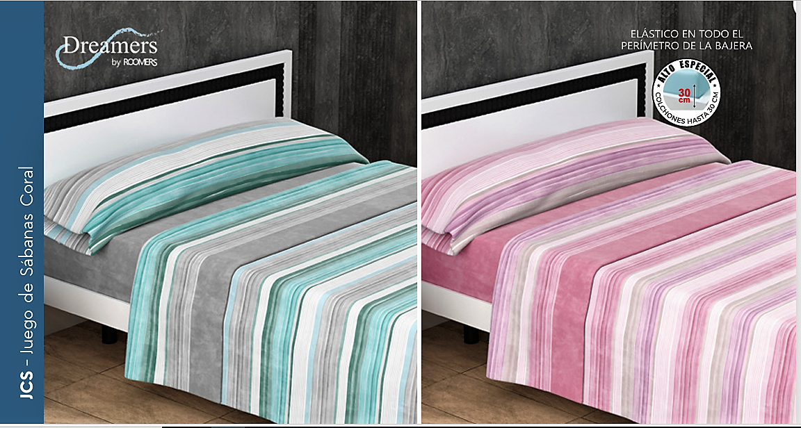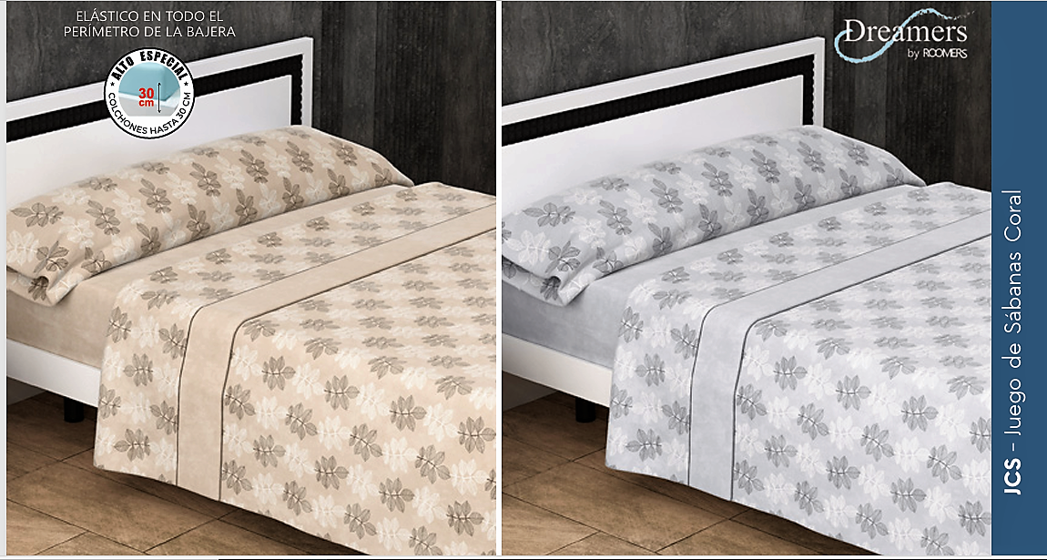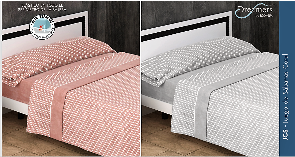 Sábana coral tacto sedalina, composición 50% Algodón y 50% Poliester, contiene: encimera, bajera ajustable y funda de almohada, colores: salmón y gris, medidas: 90-105-135-150-160-180 y 200