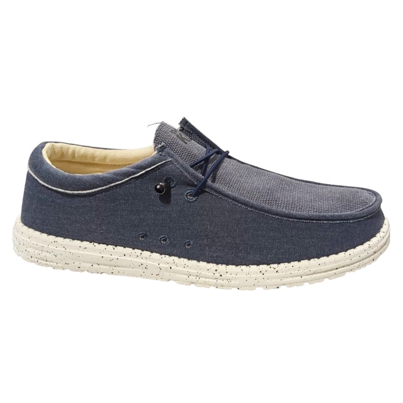 Zapatilla verano de hombre fabricada a mano en tejido imitando a la piel de ante, ajustable con elásticos a lo lados, planta entera super confort de espuma de gel Sanitized que reparte la carga al caminar, suela de goma ligera y flexible con buena adherencia que aporta máximo confort en cada pisada, colores: marino y visón